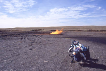 チリ カナダ人のアメリカ大陸南下隊メンバー。半年かけて南米を下ってきたのだと言った。 ![]() 退屈なパンパの中を走っていると、前方に炎が見えた。何か火事かと最初は思ったが、よく見ると、地面から火が噴いているではないか。 「ああ、なんてもったいない・・・。」 旅をしながらガソリンや水などを常に最小限で活用しようとしていた当時の私にとって、この燃え続ける炎はとにかく、 「もったいない、もったいない。」 の連発だった。四六時中噴き上がる炎を見ていると、地球温暖化のことも考えさせられた。あれだけの炎の元を、できればガスボンベにでも詰めて持ち帰りたい気分になってしまう。
