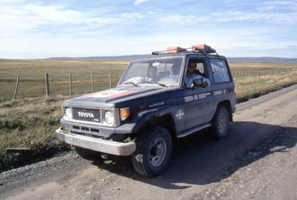 チリ チリとアルゼンチンの出入国スタンプが嫌と言うほど押された私の一冊目のパスポート。 ![]() 国境を越えフェゴ島をしばらく走ると、道は北と西に別れていた。私が向かったのは北。ここから3号線をひた走り、一気にブエノスアイレスまで北上する。アルゼンチンの大西洋側は、おそらく今まで以上の長いパンパ走行が待っているだろう。フェゴ島北部、北へ続く道は風も強く、北上するに連れ一層強さを増していく感じだ。 車の通りの少ない、寂しいパンパの光景を眺めながら走っていると、1台の日本車がこちらの様子を伺いながら私の前で停まった。 「TIERRA DEL FUEGO」とドアの部分にはステッカーが貼られ、ボンネットにはそれは大きなカナダ国旗が描かれていた。カナダ人はいつもこうして国旗を大きく掲げて旅行をしている。砂埃のついた車の窓を開け、彼らはとても楽しそうに笑いながら、 「どこから走ってきたの?」 そう聞いてきたので、 「アンカレッジ、アラスカのアンカレッジから走って来てます。」 と言うと、 「アラスカ??・・・。我々は6ヶ月もかけてやってきたのに、自転車なんて・・・気が遠くなるなあ。」 笑いながら半分呆れ顔で言った。 「車よりもやはり自転車がベターでしょ?」 と、私も冗談で言ってあげた。
