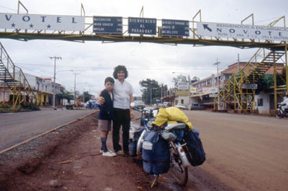 パラグアイ 入国記念写真を撮っていると「私のせがれも日本で自転車旅行をしたの」と家に誘ってくれた。 ![]() 招いてくれたその女性は、ジュースを出してくれ、息子さんが日本で暮らしていた当時の写真などを見せてくれた。観光ビザで入国して短期間働き、日本の生活を楽しんで帰国したのだと言う。私が訪ねたとき、息子さんは留守をしていたので会うことは出来なかったが。 国境を越えて走り出すと、すぐにエンカルナシオンという大き目の町に着いた。私はここで2泊することを決めこんだ。特に疲れていた訳でもないのに、休日と銘打って・・・。きっと初めてのパラグアイの町を歩きながらのんびりとしてみたかったのだろう。6ドル程の宿に投宿し、不具合な自炊ストーブの修理に、バックのほつれなどを縫ったりと、雑用なども行った。