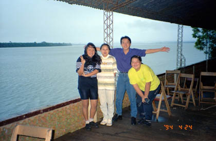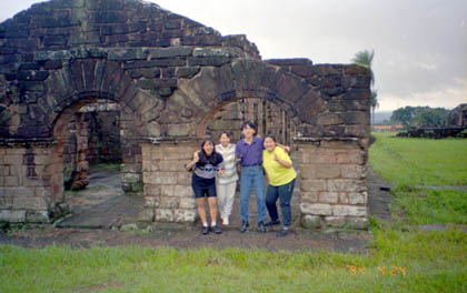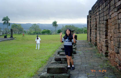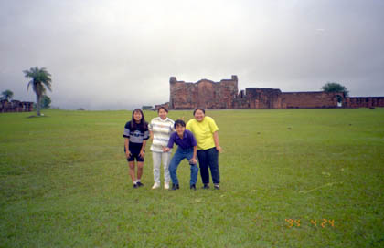 パラグアイ ちょっと怪しい女性も一緒していたカラオケ「フジ」。 ![]() 健郎君と店の人々はスペイン語と日本語を混ぜ合わせて使っていた。私にしたらとても妙な会話だった。妙と言えば、健郎君は以前日本に行ったことがあり、日本からパラグアイに帰国するなり、お母さんにこう言ったそうだ。 「お母さん、日本の窓は紙で出来てたよ。」 このカラオケではもう一人、山脇さんという40過ぎの男性に出会った。 「何や、自転車か?やっぱり日本にもアホがおったか。せっかく来たんやけ、ゆっくりしていけ。明日はオレんち刺身食べ来い。」 こうして知人も増え、私はもう一泊高橋さん宅にお世話になることになった。皆、気さくな人ばかりで、私は1日いただけでこのピラポという街が好きになってしまった。この夜、私は高橋さんちの湯船に使って気持ち良く汗を流し体を洗った。湯船に浸かる、日本人にとってはやはりこれが一番。 翌日、4月24日。高橋さん兄弟姉妹の案内を受け、ピラポ周辺を見て回ることになった。古い教会に隣のドイツ人の移住地、オブリガード。そしてアルゼンチンとの国境を成しているパラナ川。 「ここでは金色のドラドと言う魚が釣れるんですよ。刺身にするとうまいんだ。」 と健郎君が言った。また遺跡のような建物にも行き、緑の草地で駆け回った。