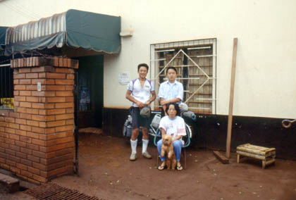 パラグアイ 高橋商店さん前で、出発の朝。健郎君とお母さんと犬。 ![]() 「これはお弁当。ちょっと重いかもしれないけど、これも・・・。」 そう言うと牛乳2リットルと缶詰を持たせてくれた。 「こんなにもたくさん・・・。」 言葉にならないくらい嬉しかった。皆さんにさようならを告げてペダルを踏み出すことに。 「さようなら、高橋さん。」 園田さんには会えなかったが、高橋さん家族の温かさに触れることができた。また機会があればもう一度、あの高橋商店へと足を運んでみたい・・・。