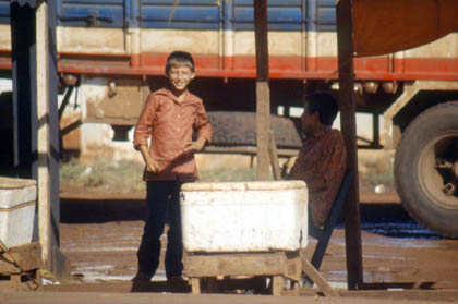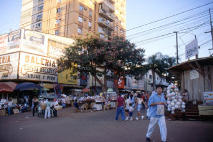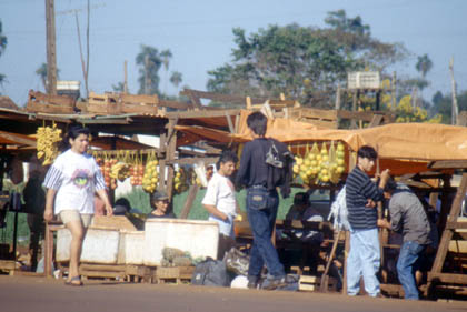 パラグアイ タワプのスタンドの裏でテントを張った。 ![]() 翌日4月27日。いよいよイグアスの滝を見るべく、シウダーデルエステの街に向かった。南米でも3本の指に入る観光地、イグアスの滝。ここを通過すればもう、南米の終着予定地、ブラジルのリオデジャネイロまでもう少しだ。私は、 「イグアスの滝・・・イグアスの滝・・・」 と口にしながら走っていた。 何時間走ったか、午後、パラグアイとブラジル国境の街、シウダーデルエステに到着した。ここは街全体が免税地帯。ブラジルに続く道の両脇は多くの物と人でごった返していた。ゴミも散らかりまくり、子供たちは台車を持って飛びまわり、数多くの露天商が出まわり、その活気に圧倒された。そんな活気ある人々の様子をカメラに収めた。