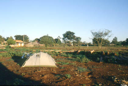 パラグアイ 山脇さんにもお礼を言って出発した。 ![]() ピラポを出てしばらく走ると、首都アスンシオンへの出張から帰って来たと言う園田さんが車で私を追いかけてきた。 「待井君かい?わざわざ来てもらったのに、悪かったね。ちょっとメシでも食べよう。」 そう言って近くの店で園田さんと話すことができた。聞いた話しはやはり34年前の開拓話や、移住の苦労話しだった。誰に聞いてもそれぞれの経験談があり、とても興味深く聞き入った。 「今は生活にもゆとりがあって、のんびりだよ。種まきと収穫の時以外は体は休められるしね。」 50歳近い園田さんは、ゲートボールの審判員に、ピラポの副村長(?)、バレーボールの監督と幅広く活躍されていた。 私が訪れたピラポは、「気さく」で「のんびり」とした雰囲気だった。しかしその裏には想像を絶する苦労の歴史があったに違いない。目を生き生きと輝かせて私を見る園田さんの話し口調は、どこか力強かった。 園田さんと別れ、夕刻まで走り、地元の人に断ってテントを張らせてもらうことにした。