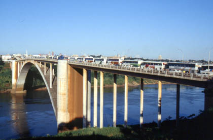 パラグアイ 観光バスでひしめくパラナ川に掛かる橋。イグアスノ滝はすぐそこにある。 ![]()