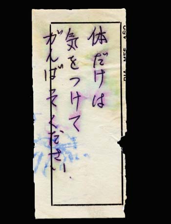 パラグアイ こんなところにテントを張って眠る日も。 ![]() テントの中で楽しみにしていた「高橋さん弁当」を頂くことにした。ずっしりとしたお弁当には手作りのおにぎりが入っていた。そしてお弁当の上には1枚の紙切れがあり、そこにはメッセージが書かれていた。 「体だけは気をつけて、がんばってください」 それは高橋さんの心だった。その言葉にはとても力強いものが込められていたように感じた。開拓の苦労を、もしかしたら地獄を、厳しい生活の中を生き抜いてきた人の貴重な励ましの言葉だったのだ。私は嬉しくて、そして感謝の気持ちでいっぱいで、お弁当に手を合わさずにはいられなかった。孤独な旅ゆえ、こうした温かさが心底身に染みる。温かく、力強い人々に囲まれて私は毎日ペダルを踏み続けることができている。改めてそう感じた。 「高橋さん、本当にありがとう。頑張って走ります。」 さようならピラポ。さようなら高橋家の皆さん・・・。