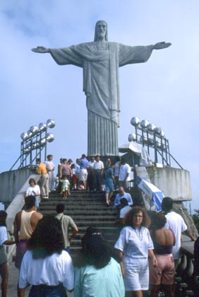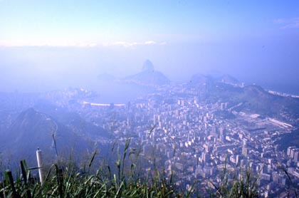 ブラジル コルコバードの丘へ、スイス製のケーブルカーに乗って行く。 ![]() 山頂には日本人も欧米人もウジャウジャ。国際観光都市のリオはやはりすごい。熱気もムンムンと言った感じだ。リオの名所のポンジアスーカが海に美しくぽっかりと浮いている。この風景を見ると、本当に私は日本の裏側まで走ってきたのだと実感した。