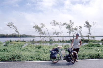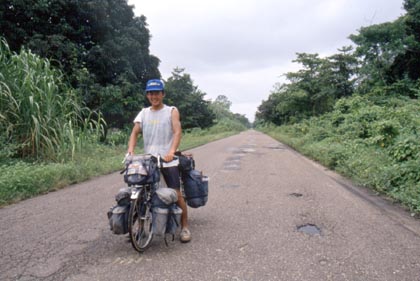スリナム コペナム川で。 ![]() 川を渡ると再び平坦な道は伸びていた。日中は晴れてもいないのに、暑苦しく、ムシムシとした気候。国境のガイアナ方面目指し、ひたすらペダルを踏んだ。