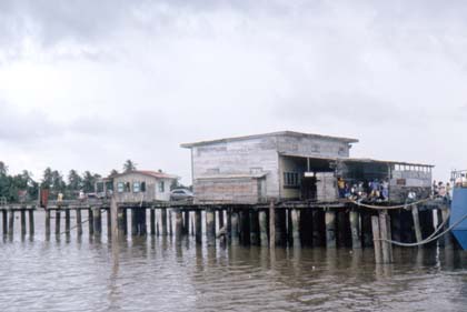 スリナム これ以上はもう乗らない、と言うくらいのたくさんの人々が船に乗っていた。 ![]() たくさんの人々を乗せた船は、まるで陸を歩く亀のようにゆっくりで、トイレに行くのはまず不可能な状態だった。船上で人々の様子を伺いながら過ごすこと、約2時間。ガイアナの陸地や建物などが見えて来た。イミグレーションらしき建物の姿はなく、どれがそれなのかは分からなかった。 船は、水上に建てられた木の掘ったて小屋にと向かっていく。 「あれはイミグレーションですか?」 地元の人に聞くとそうだと言った。