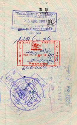 スリナム 一度押された出国のスタンプは再びバッテン。(下段) ![]() どうかしようにも、土日は銀行も休み。私は腹が減っていたので、とりあえず中華の店に足を運んだ。 「チョウメン下さい。」 注文取りは蝶ネクタイをした黒人だった。とても人が良さそうで、自転車世界一周の話をしたことから、今日の情けない一連の入国拒否の話にとつながっていった。香港出身の店の主も顔を出し、私のトラブルを聞いてくれた。すると彼は、携帯電話を取りだし、即座に私のカードで銀行でキャッシングできるかどうか聞いてくれた。スリナムで携帯電話を持っているなんてすごいな、などと思いながら・・・。 「何の種類のカードだ?」 「アメックス、ビザ、マスターですが・・・。」 「月曜日の朝銀行が開くから、そしたら、カードでキャッシングができるはずだ。」と言った。 「こんな田舎でまさか、カードでキャッシング?いや、でもオランダの息がかかっているし、その辺はかなり進んでいるのかもしれない。」 私は半信半疑で月曜日を待つ事にした。パラマリボの首都に戻らずに、ここでそんなにも簡単にお金を、それもドルキャッシュを手に入れることなんてできるのか。それなら本当に助かるけど。 私は土日はニウニッケリーの町に滞在し、部屋にこもって手紙書きと雑記をまとめた。気分転換に町に出ては中華を食べ、早く月曜日が来ないかとウズウズしていた。 翌々日の月曜日、銀行は7時半からの営業と言うことで、早速行ってみた。しかし、悪い予感は的中。街中の銀行という銀行へ足を運んだが、やはりそれは無理な話。このニウニッケリーの銀行にはATMが置かれていたので、銀行はしっかりしているかもしれない、と思ったがやはり甘かった。 飯代とホテル代、首都へのバスの運賃。私の手元に残った資金は10ドルのみ。これで現在自転車世界一周中とは我ながら信じ難い。どうなってしまうのか。 翌朝、バスを待っていた。ところが長蛇の人の列。バスの運行の本数はまったく需要に追いついておらず、首都に行けずに何時間もバス待ちする人々が圧倒的に多い。男たちは力ずくで席の確保をしていた。やってくる車の窓に飛びつき、荷物をそこから放り込み、その窓から乗り込む。席取り合戦にはとても参加できなかった。 パラマリボ行きの第一便に乗ることは出来なかった。2便目も来た。しかし、これも迫力のある男たちに阻まれ、またもバス席を獲得することは出来なかった。とにかく争奪戦はすごいのである。 こうして1台目も2台目も逃してしまった。どうしよう。すると、もう1台客の少ないバスがあった。こちらは混んでいる方に比べると、値段は3倍もする。パラマリボに着くのに約4時間。今は時間を優先させてこの高いバスに乗ってパラマリボへと向かうことにした。 パラマリボに着くと、早速手当たり次第銀行を訪ね歩いた。 「あの、カードを使ってキャッシングできますか。このカードを使って・・・。」 何軒歩いても無理だった。 「おそらくスリナムの銀行などでは無理だろう。」 それを承知で歩き回った。案の定、1軒も探し出すことは出来なかった。 「このままではおそらくダメだ。やはりヘルプコールなのか・・・。」 結局私は日本大使館に出向くことにした。情けないことは承知のうえで。地元タクシーの運転手に日本大使館まで乗せてもらい、スリナム大使館の門を叩いた。 とても小さな大使館には、山田臨時大使という方が一人で勤務していた。 「あの、私、こう言う者で、これこれこうで旅をしておりまして、実はその、誠に話しにくい事なんですが・・・」 そう切り出すと、大使はすぐに、 「お金ですか?」 と言った。いや、言ってくれた。こうした事例はたくさんあるのだろうか。私が長々と事情を説明すると、山田臨時大使は、 「この国は日本のものさしでなんか計ったらダメなんですよ。」 と言った。外貨も物凄く不足しているし、日本からの送金も危なくて、何日掛かるかも分からない。山田大使はいったい現金をどうやって手に入れているのかと聞くと、 「マイアミやニューヨークに用事に行ったときに、そこでドルのキャッシュを手に入れて来るのです。」 と言った。 私は大使から300ドルくらいを借りて、隣の仏領ギアナで資金を手に入れて返すか、或いはブラジルに戻ってトラベラーズチェックを購入して大使に返すか・・・と色々考えた。でも、そうすると、またあの170ドルの強制両替をしなくてはならない。どうしようか・・・。私はいくつか手段を考えてはいたが、山田大使はこうしようと言った。 「私が今、ここであなたに1000ドルキャッシュを渡します。あなたは日本の実家に連絡を入れて、1000ドル分の日本円を私の日本の口座に振り込んでください。そして、その振り込みの証明書をファックスでスリナム大使館宛てに送ってください。」 と。なるほど。それは一番確実で早く、私は実際に動かなくて済む。でも、両親には手間を掛け