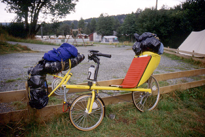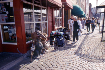 ノルウェー ブレインステインの街のベルゲンキャンピングパークで。 ベルゲンのインフォメーションセンターに、 「アイスランド行きの船の事、少し聞きたいんですが。」 と電話を入れると、 「毎週火曜日の午後3時発です。何時間掛かるのか、運賃がいくらなのかは分かりませんが。」 そう言うと、相手の女性は船会社の電話番号などを教えてくれた。 「来週の火曜日ならば、土、日、月と市内観光に、雑用に、アイスランド行きの準備にと、出発まではちょうどいい時間が取れるぞ。」 という事で、この日はキャンプ場で溜まった洗濯物を洗ったりして、のんびりとリフレッシュして過ごす事にした。 翌日、ベルゲンに向けて出発。と言ってもわずか30kmの道のり。このブレインステインのキャンプ場に滞在して雑用をこなした方が安上がりかもしれないが、ベルゲンの美しい街並みはゆっくりと見ておきたい。また何かと準備するにも、やはり大きな街は便利だ。車の通りも少なそうなこの日は日曜日。天候は書き留めるまでもなく、雨。 出発間際に風変わりな自転車でツーリングをしていたイギリス人サイクリストと情報交換。ついでに自転車の写真も撮らせてもらう。