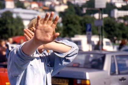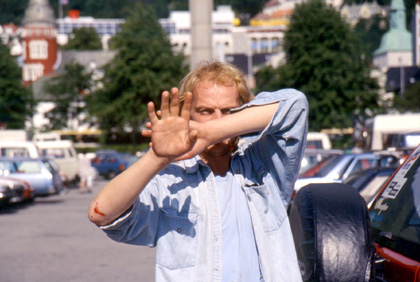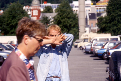 ノルウェー 確かに置いたのに・・・「ない!」 キョロキョロ見回してみるがどこにもない。自転車は消えてしまった。私の目の前は真っ暗になった。言葉ではとても言い現せない心境だった。盗まれたと頭の中で判断したその2、3秒の瞬間に色々な事が頭をよぎったような気がする。 「ああ・・・」 人通りの多いのが本当に幸いだった。自転車を置いた場所に立っていたお姉さんが、私に、 「あっち、あっち。」 と、犯人の逃げた方角を指差してくれた。私は無我夢中で走り、通りの曲がり角の辺りで360度見渡した。すると左90度前方に、 「あ、いた!!」 銀のキャリア、青いフレーム。私の飛脚号が。 「犯人だ、犯人だ、いたいた!」 約50mくらい前方だっただろうか。私は全力疾走で追いかけた。犯人はいささか酔っ払った感じでフラフラと自転車に乗っている。私はすぐに彼の所に追いつき、自転車のキャリアをガっと掴んだ。 「やった掴んだ!」 グイっと自転車を倒すようにすると、犯人は自転車からひょこりと降りた。なんだか、酔っ払って危ない犯人だが、特に私の前から逃げる訳でもなく、反抗するわけでもなかった。人の目の前でVサインなどをしている。 「へ?な、なんなだこいつは?」 自転車が欲しそうでもなく、悪気もなさそうで、こちらは拍子抜けしてしまった。よく見れば犯人のあそこのチャックも全開じゃないか。まあ、とにかく自転車、飛脚号は戻ってきたのだから、良かった、良かった。 気付いて見たら、私の足はガクガクしており、心臓はバクバク。こんな私をよそに盗んだ犯人はと言えば、フラフラとまだ近くを歩いていやがる。 「んー、これは・・・。」 何を考えたか、私は、 「これはめったにある事ではないしなあ・・・よし。」 と、港周辺を歩き回っていた犯人の写真を激写してやった。