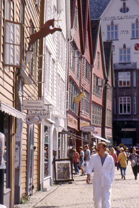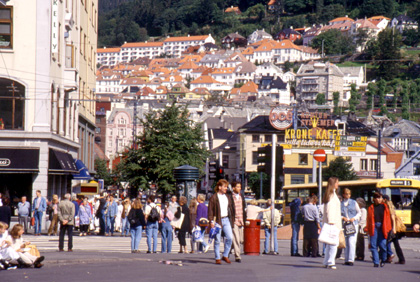 ノルウェー イギリス人による北欧ツーリングスタイル。 「天気は今までどうでした?」 「いつもこんなだよ。」 憂鬱そうな顔をして彼は空を指差した。 ベルゲンの街まではやはりアップダウンが続いた。午後の3時くらいには街に到着。繁華街にあるインフォメーションセンターに到着し、早速地図をもらってユースホステルの場所を聞き目指した。ところが、インフォメーションのお姉さんが印をしてくれた所へ行っても、ユースなどありはしない。 「どうなってんだ?確かにこのストリートとこのストリートの間なのに・・・」 近くにいた青年に尋ねてみると、 「ユースならもう少し上の方だよ。ユースの案内板があるから分かると思いますよ。」 と言ってくれたので、更に進んでいく。坂道を走っていると、どうも後輪のタイヤがおかしい。 「・・・パンクだ。」 アラスカを出発してから82回目のパンクである。修理もせずに私はそのまま約1.6kmの坂道を自転車を押して上った。 ユースは高台にあり、見晴らしが良かった。値段は朝食つきで2100円。べらぼうに高い(私にとっては)。それでも市内ではかなり安い施設のようだ。ユースホステルと言っても、老人に子供にカップルにと、色々な顔ぶれが揃っていた。 欧州各国のサイクリストも多く、私がユースの外でパンク修理をしていると、イギリス人サイクリストが話し掛けてきた。2ヶ月の予定で北欧、エストニア、ベラルーシ、旧ソ連を走るのだと言い、1日だけアイスランドに立ち寄って来たと言った。船の代金のことを聞いたら、飛行機で来たので分からないとの事。でも、アイスランドは自然いっぱいで、美しい国だそうだ。 1994年、8月22日、月曜日。この日は私の旅の中でも忘れる事の出来ない1日となってしまった。 朝から色々と雑用をすべく、ユースで腹ごしらえをする。高いユースだけに朝食も豪華。と言うか量が多く、バイキング形式だったので、ここぞとばかり胃袋に詰め込むことにした。コーヒー2杯に10センチ四方の小さめのパンを6枚。更にハムとチーズ、もう苦しくて食べれないと言うくらいまで食べた。朝から満腹で苦しい・・・。 朝食を済ませて街へ出掛けた。天気はすこぶるよく、青空マーケットを見て歩くと、とても清々しい気分になれた。美しく陳列された魚や野菜、フルーツなどを見て歩くと今までの雨の中の走行も嘘のように感じられてくる。