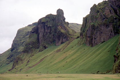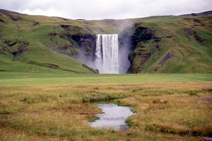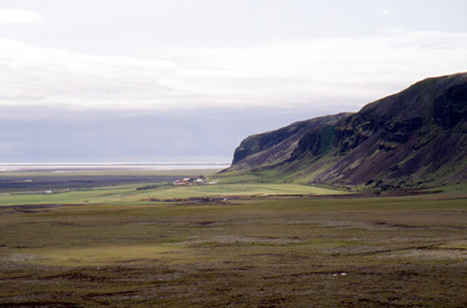 アイスランド 前方は雨。あの雨に降られなければ良いのだが・・・。 ![]() 途中には大きな滝が、緑の芝生を敷き詰めた岩場から流れ落ちていた。なんと鮮やかな色だろうか。一方には岩場と崖とまばらに生える芝生。そして海側には何もない平坦な土地。道を挟んで左右まったく対照的に見える光景が珍しかった。