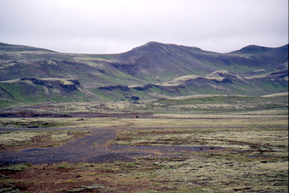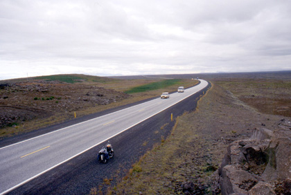 アイスランド さっきまでの街並みはどこかへ消えた。大自然の中にポーンと投げ出されたよう。 ![]() 周囲には、草のような苔がへばりついたボコボコの岩とも土とも区別のつかない土地が広がっている。強風の為なのか、木々はほとんど見当たらず、不毛の地と言った感じだ。標高200m位の丘の頂きに着くと、遥か向こうに地平線が見えた。 「あの道を走るのか・・・」 もっと極端なアップダウンや山岳地帯を想像していただけに、意外な光景が目の前に広がっていた。