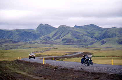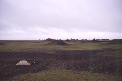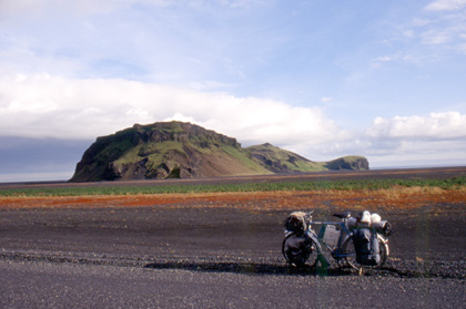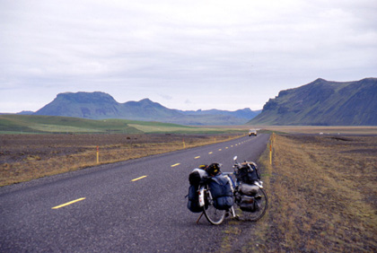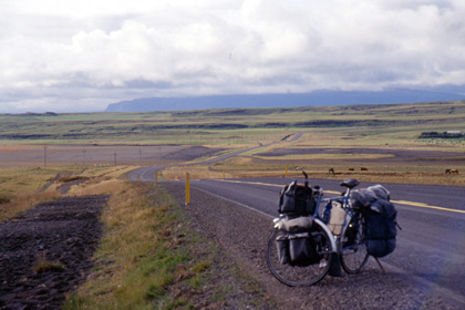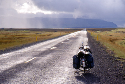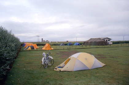 アイスランド 住宅地のすぐ近くに設けられたコウパボギュルのキャンプ場。 ![]() テントを張ってから私は近くのスーパーに買出しに行った。ところが意外や意外。物価は小林さんの言うとおり、ノルウェーよりも安く感じられ、ほっとさせられた。また、スーパーでは喜ばしい発見をした。英語の表示ながらも、日本の「出前一丁」を見つけたのだ。久々のラーメンにありつけ、私は涙が出るほど嬉しかった。 キャンプ場ではカップルのドイツ人サイクリストが2週間の予定でアイスランドを走り終え、テントを張っていた。調度いい旅行者に出会えたと、島の情報をもらった。話題はやはり風のこと。この島ではパタゴニアのようにものすごい風が吹くらしい。その風は北東からとの事。私が、 「2週間で島1周は?」 と聞くと、 「運が良ければね。」 と答えた。どうやら島一周は風に大きく左右されそう。ともあれ、今日は無事にアイスランドに着いた。累計の走行距離も、あと508kmを走ると、目標の半分、5万kmに到達する。うまい「出前一丁」のラーメンを食べてテントで眠りについた。 翌日、準備をして出発しようとした。すると、昨日情報交換をしたドイツ人カップルが、 「この島のキャンプ場のリストを持っているかい?」 と聞いてくるので、 「いえ。」 と言うと、 「良かったら、これ使ってよ。僕らはもう、帰るから。」 ちょっとしたキャンプ場リストの紙を渡してくれた。アフリカも言った事のある、その旅好きな彼は、 「アフリカ縦断、サハラ縦断も今はアルジェリアがああ言う状態だから、まず、あそこには行かない方がいいだろうね。」 と言ってくれた。まさかアイスランドでアフリカの情報交換をするなんて思っても見なかった。 出発は9時。アイスランド1周を開始した。2週間で1周は、地図を見てもかなり厳しそう。最悪は1周を断念して、レイキャビクまでバスで戻るという事も年頭に入れておかなければならない。 主要道の1号線を南から半時計回りで走り始める。市内を抜け、島の周遊道路に出ると、一直線の道が続いていた。首都の周辺にあった建物はいつの間にか消えてしまい、まるで大自然の中にポーンと放り出されたようだ。