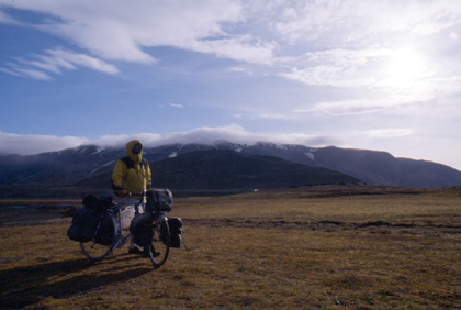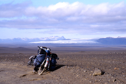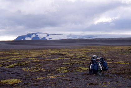 アイスランド 準備完了。今日も元気に走り出す。 ![]() 夜中にはかなり強い風が吹き、テントはしなっていた。ぺグはしっかりと打っていたので、なんとか無事に朝まで持ちこたえてくれた。 明朝はやはり強風が吹いていた。運の良い事に追い風。前方には大きな雪帽子の山。目の前の風景はパタゴニアに似ている。右手には氷河が見え、後方にも風変わりな山が。私は写真をこれでもかと言うくらいに撮った。 小さな石が多く、荷物も多かったせいか、午前中には前輪がパンク。午後には後輪がパンク。マウンテンバイクのタイヤに比べれば本当に細いタイヤで、遠慮がちに走ってしまう。参った。パンク修理をしていて初めて気がついたが、なんと後輪のスポークが知らない間に2本も折れていた。これにもびっくり。