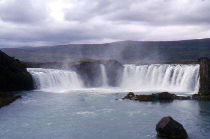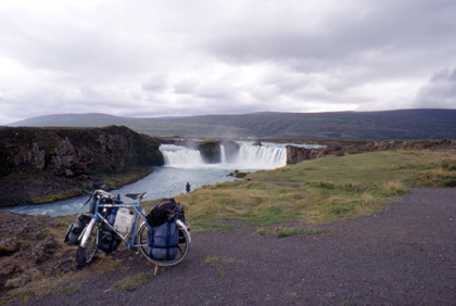 オフシーズンなのだろう。広いレイクヤフリッドのキャンプ場に宿泊していたのは私一人だった。独り占めして使えるのはいいのだが、時期はずれで誰もいないと言うのはどうも淋しい。誰かから少しでも情報を得たいと思っていたのに。 今日の天気は曇り空に時々小雨。風は北から。今日は追い風を味方に距離を稼ぐ事ができそうだ。 ミー湖畔を走っていると、3、4羽の白鳥が私の前を横切り舞っていった。ここアイスランドにも白鳥は飛来してくるのか。 しばらく走ると、観光名所のような大きな滝があったので少し見学していくことにした。