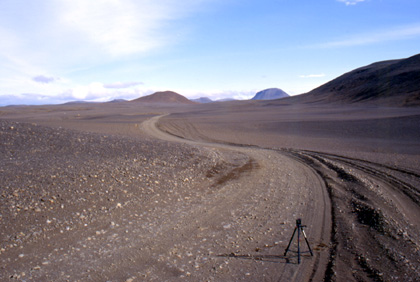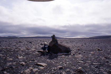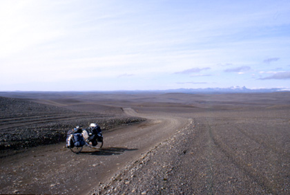 アイスランド アクレイリから上った坂。これを上りきるとアイスランドの屋根のような部分に着ける。坂は写真中央部より延々と上っていた。 ![]() アクレイリからの上りは約24km。約3時間を費やした。このとき私はキャラメルを口に含みながら走っていた。ところが、出発前に治療したはずの奥歯にかぶせた銀歯がキャラメルを噛んでいると、ポロリ外れてしまった。 「ああ、とれた・・・まずい。」 私は焦った。取れた銀歯を元の位置にはめ直し、ググっと噛んだ。するとうまいことはまってしまうではないか。今は銀歯の歯抜けに構ってはいられない。アイスランド出国に向けて急ぎ足で走らねば。こんな大事な時にとれても困るのだ。このままはまってくれ。私はバカだった。単純にも、仮に直ったと、それで済ませてしまったのだから・・・。なんと軽率な応急処置だっただろう。 これは後に、イギリスとインドで治療を施すことになる箇所。中国カシュガルの食堂でラーメンと共に私の胃袋に入り、その後尻から・・・という長い旅をする運命の歯でもあったのだ。 長い長い渓谷を上り切ると、緑は消滅、ほぼ360度遮るものの無い不毛の大地となる。周囲を見れば、石、黒土、灰色の雲、更に遠くに見える山々・・・。不毛の地と言うのはこういう場所のことを言うのだろう。まるで月面のような世界がそこに広がっていた。