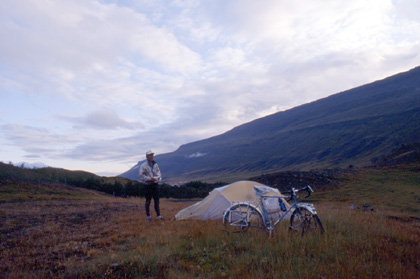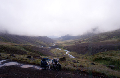 アイスランド アクレイリ過ぎた山中にテントを張った。 ![]() 9月8日の朝。あと4日でこの島を脱出しなければならないと言うのに、私はまだ島の真ん中。ここを南下して縦断しようとしている。 「こんなんで本当に大丈夫なのか?」 自問自答したい気分だった。残り少ない期間内になんとか走らなければ罰金が待っている。そんな風に考えると、意地でも走らねばと思うのであった。 標高100mから一気に900mまでU字形の渓谷を上って行く。アイスランドの坂はノルウェーとは比べ物にならないくらい急勾配でハード。私のようなキャンピングタイプの自転車で走行する場所ではないように思う。こんなときこそマウンテンバイクが欲しい。坂の勾配も12%〜16%はざらである。