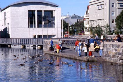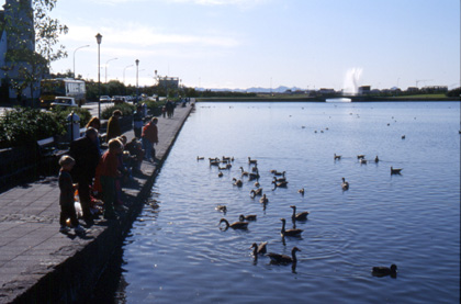 アイスランド レイキャビクの街でカモと戯れる市民。