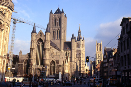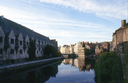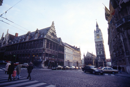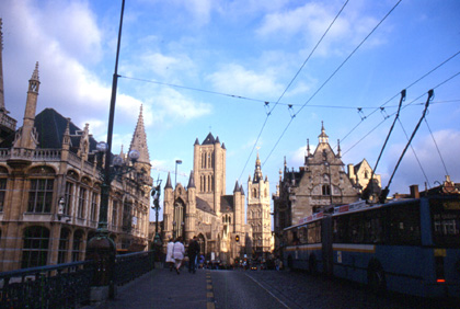 ベルギー 彼らとは結局仲良くなって最後には記念撮影。 ![]() アントワープを後に私が目指した町はゲント。ブルージュとアントワープのちょうど中間に位置している街である。チャングさんたちもゲントの街については、それは美しい街だと言っていた。ワクワクしながら走っていた。 ベルギーの道路事情はオランダとは違っていた。オランダの場合、自転車道のほとんどが車道と分離されて造られていた。それはそれで安全だったが、ベルギーの場合は車道の横に白線が敷かれ、その広い区域が自転車及び原付バイクの走る道と定められていた。自転車専用の標識もないので、車の為に造られた行き先表示を見ればそれで良い。私のような海外から走りに来た者にとってはとても走りやすい道で、このベルギーの道が一番いいと感じた。オランダのように余り発達しすぎても何なのだ。 ゲンテに向かう道中は特に迷う事も無く、午後の4時には街の中心街に着く事ができた。街は噂通り、本当に美しかった。目に入ってくる教会に寺院、古きよき時代を思わせる、まさに中世の世界のように目に映った。あまりにも街並みが美しいので、路上で「ポカーン」と、口を開けて立ちすくんでしまったほどである。秋と言う季節、それに夕日と古めいた街並みが、とてもよくマッチしていた。