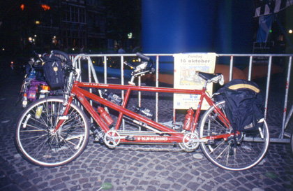 ベルギー 夜の街で見掛けたのはタンデム車だった? ![]() 最近は平坦走行が続いており、体力もあり余っていれば大喰いしなくなったか。ヨーロッパでは物価高を除けば不自由もなく、軽快な走りが出来ているように思う。 翌日、10月17日。快適な目覚めだった。何と言っても宿があり、身を落ち着ける場所があるというのは本当に精神的にも楽だ。野宿もしない昨今は、財布の口も開き気味。走行距離もそれほど伸びない。ちょっと甘えた観光の日々が続いている。 早めにブルージュの町に着いてのんびり観光をしようと、朝食を済ませて出発しようとした。すると、ユースの玄関でカナダのカップルサイクリストと偶然出会い、少し情報交換をすることに。 「ルクセンブルクはとにかくアップダウンが多い。でもきれい。東欧は山あり谷あり、丘あり、雪もあって、まるでカナダのような寒さだよ。」 と言った。 私の世界一周の話となると、彼らは、 「エンジョイしているかい?」 と、野暮な質問をズバリしてきた。そう聞かれれば、素直にエンジョイしているとは言い難かった。日本食も恋しいし、日本文化も恋しい。出発から2年半を過ぎた今はホームシックでないと言えばウソになるかもしれない。しかし、この旅を完走できずに中途半端に挫折するのはもっと悔しい。私は、 「自分自身への挑戦なんですよ。」 などと格好つけて答えたりした。