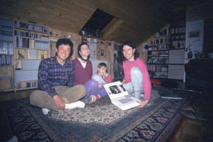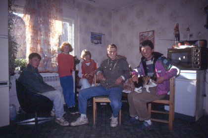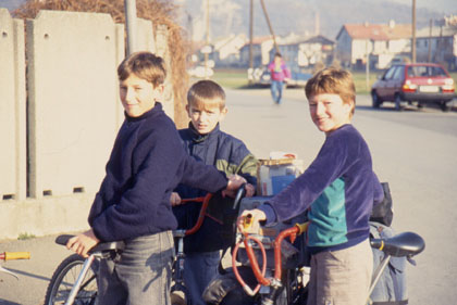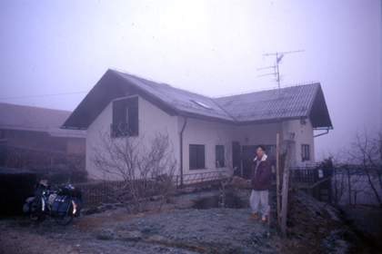 スロベニア 言葉が通じていれば・・・。少年たちは親切にホテルへの道を案内しようとしてくれた。 ![]() マリボルの街を出る前に20マルクを両替して、出発。途中にあったファーストフードの屋台でハンバーガーにかぶりつき、腹を満たしてオーストリア国境向けて、北上した。 午後の2時半から3時くらいの間だった。私がペダルを踏んでいると、前方で1台のYUGO製の車が停まった。中からは30歳くらいの若い男が出てきた。そして、私に、 「時間はありますか?」 と言ってきた。 「ええ別に。ありますよ。」 「もし良かったら、今夜家に来ませんか?私も実はインドへの旅行経験があって、旅は好きなんですよ。」 特に怪しい雰囲気は感じられない。どことなく、日本の俳優「ヤクショコウジ」に似ていないこともない。私は願っても無い誘いだと喜んで、 「それじゃ、1泊お願いします。」 と言った。彼の名はデュラシュさん。 「この先、だいたい50分くらい走ったら、右へ曲がってください。ネゴバという地区があります。そこに住んでいますから。」 そう言うと、紙に住所を書いて渡してくれた。デュラシュさんは、 「4時には家にいますから。」 と言い、車で走り去って行った。 しばらく走ると「ネゴバ」という看板があった。それを頼りに小さな丘を越えると、田舎村「ネゴバ」に着いた。 「えーっと31番地、31番地・・・ここか。」 わりと良さそうな家の造りだ。近所の家と比較してもどこか違う。 呼鈴を鳴らすと、彼の奥さんらしき女性が出迎えてくれた。そこに、 「ようこそ。」 とデュラシュさんが笑顔で顔を出してくれた。 その昔、デュラシュさんは英国やドイツなどで働き、9年間も世界を渡り歩いたのだと言った。現在は31歳。どうやって資金を貯めたのか、なぜ9年も旅をしていたのかは分からないが、家にはインド人の新興宗教まがいの教材がたくさん置かれていた。ちょっと怪しげだが、私は普通に振舞った。 夕食は、奥さんのサビーナさんが、手作りワインにパン、ポテト、ほうれん草の炒め物などを作って出してくれ、とてもヘルシーな料理で歓待してくれた。 インドに行った時の話を聞きながら、ビデオを見たりもして、温かい部屋でゆっくりとデュラシュさん家族とくつろいだ。この日はフカフカのベッドで夜11時に横になった。