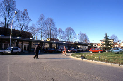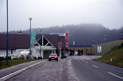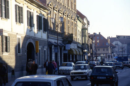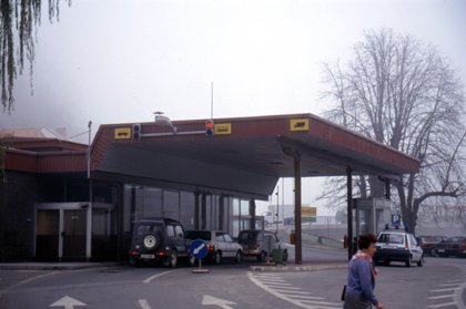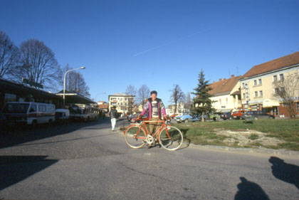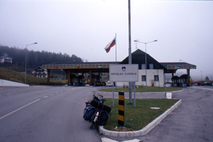 スロベニア 国境付近の様子。 ![]() スロベニアに入国すると、ロシア系の顔つきの人々が多く見受けられた。入国してすぐに、係官の一人が私に、 「もうどれくらい旅をしているの?今までどこを走ってきたの?」 と聞いてきた。私のイメージしていたスロベニア人とは少し違っており、なかなかフレンドリーな感じ。もっとツンツンした、サービス精神という言葉を知らない氷人間みたいな人々を想像していたのだが。意外に親しみやすい人々の存在に、明るい出会いの展望が開けたような気がした。 「さあ、スロベニアだ。」 周囲に走る車はルノーのかなり古い型。あるいはユーゴスラビア製のいかにも東側らしい車。それにベンツや真新しい日本車も。年代も様々で、自動車の普及状態が旧ソ連崩壊の様子をそのまま示しているようにも思えた。 真っ先にあったポハナと言う街で、オーストリア通貨のシリングをスロベニア通貨に両替した。