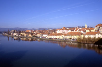 スロベニア ドラバ川をマリボル市内から眺めた。オレンジと白ですっきりとまとまっており、美しい街。