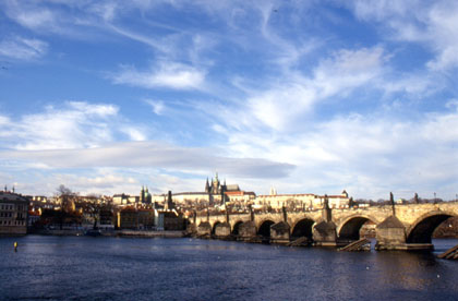 チェコ ブルタバ川に架かるカレル橋。丘の向こうにはプラハ城。