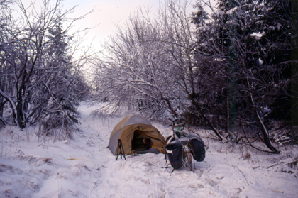 チェコ 吹雪の中に立つ娼婦たち。 ![]() 彼女たちも寒い中頑張っているので、私も頑張る。負けずに峠山頂を目指して走った。雪は降り止まず。薄暗くなった5時にようやく国境近くの峠山頂に辿り付いた。 「着いたか・・・。」 辺りはほとんど真っ暗だった。安宿でもあれば大喜びで飛び込むのだが、辺りにあるのは一軒の小さなレストランのみ。 「今日もテントか。」 周囲には雪が積もっていたがしょうがない。近くの林の中にテントを張ることに決めた。近くのレストランに出向き、メニューを見て適当に頼んだ。暖かいスープを飲んで芋を食べて肉を食べると、人心地を取り戻した。 「明日はドイツかあ。いや『旧東ドイツ』に入るんだ。」 雪上でテントを張って一夜を過ごした。 翌日1994年12月15日。雪上テントとは何年振りだろうか。冷たい空気の漂う寒い朝だった。