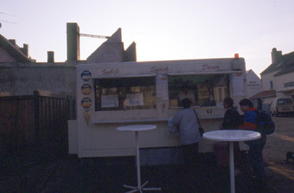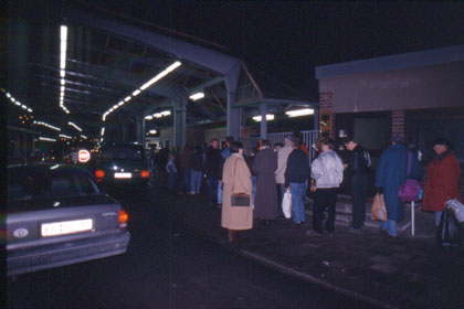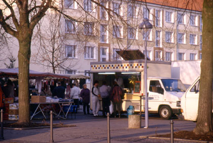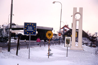 ドイツ こうした軽食屋でサンドイッチなどを食べる。 ![]() とにかく明るいうちにポーランドへ入国して、ポーランド国境の町で安宿をとれればベストだと思った。朝は8時半の日の出で、午後は4時にはもう薄暗くなってしまう。焦りながらの走行だ。切羽詰った思いで必死にペダルを踏む。たったの100kmなのになかなか進まない。 ドイツとポーランド国境の町の名はフランクフルト。ようやく辿り付いた国境の街では余ったマルクの小銭でパンを買った。 「これでドイツの走行ともおさらばか。」 私は歩行者に混じってポーランドの国境へと進んだ。どこか雰囲気が似ているなと思い出したのがアメリカ、メキシコの国境だった。長い車の列にビニール袋をさげて歩く多くの人々。地元の人々は身分証明書やパスポートを提示しては頻繁に国境を行き来している。私も順番を待ち、パスポートを用意して、ポーランドの入国を待った。