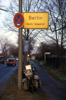 ドイツ ベルシッケンドルフの村の近くの空き地でテントを張って過ごした。 ![]() 翌日12月17日。ベルリン目指して朝8時半に出発。昨日降り積もった雪は一夜のうちに消えてしまった。思ったよりも昨夜は冷え込まなかったようだ。 「さあ、今日はベルリンだ。」 快晴の気持ちの良い空の下のスタートだった。街を通る毎に石畳の上をガタゴトと走る。こうも毎日ガタゴトが続くと少し尻が痛くなってくる。 「ここは旧東ドイツ域か。」 地味な壁の色をした家も、壊れかけのレンガの家も、毎日走っていたら見慣れた風景として目に入ってくる。 「ベルリンの壁跡、そしてブランデンブルグ門まではもう少しだな。」 小腹がすいたので、大きなスーパーの横にあったショップでサンドイッチを買った。横にいた見も知らぬ女性が、いきなり明るい笑顔で、 「ハーイ。」 と言った。私は少し戸惑いながら、 「あ、ハーイ。」 と答えた。こういう人も確か西側にはいなかったような気がする。