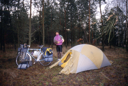 ポーランド 狭い道を大きなトレーラーが走るので恐ろしい。2号線をワルシャワ向けて。 ![]() 小雨の降るこの日は暖かかった。摂氏3℃。極寒の雪上走行を予想していたのだが、やはりかつてのアラスカほどではないようだ。平原をひたすら東へ走って、途中スタンドで一休み。地元のおじさんが、 「ふにゃらら・・・」 と声をかけてくれたがまったく理解できず。 「あの、英語は?」 と聞くと、 「ルスキー。」(ロシア語なら) との答えに閉口。ロシア語などまるでさっぱり分からない・・・。 ひたすら退屈なハイウェイを乗用車横目に走った。この日は118kmを走り林の中で野宿することにした。
