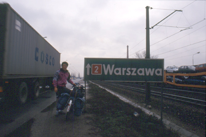 ポーランド 東へ走っていると、毎日起きる時間を早めなければならなくなる。 ![]() 早くワルシャワ入りして銀行で小切手をキャッシュに両替しておかなければ、年末年始は皆休みになってしまうのではないか。少し焦り気味で朝8時手前にテントをたたんで出発。 朝10時、レストランに入って(すっかり日々外食)スープにパンで朝食を済ませる。これで2ドルくらい。「フリスキー300g」というスープがすっかりお馴染みの定番メニューとなった。牛の腸を千切りにしたようなものが入っており、スパイスが効いたスープでなかなかうまい。これにパンがくっついてくる。腹が減っているときに食べるとたまらなく美味く感じる。20分程で朝食を済ませ再び走り出す。出発して何時間経ったか、ようやくワルシャワに入った。