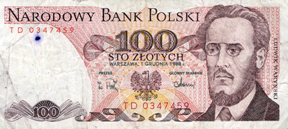 ポーランド 国境を渡る人々の図。 ![]() 国境にはカントールと呼ばれる両替所があった。ここで旅行小切手を両替しようと思ったが、ドルキャッシュかマルクキャッシュのみと言われてしまう。東欧の両替事情は、小切手の方がレートが良いものだと思い込んでいたが、どうも使えるところは限られているらしい。とりあえず私はここで手持ちの100ドイツマルクをポーランド通貨に両替することにした。 「100ドイツマルク。ポーランドのお金でいくらになるのかな・・・。」 両替所で換金された通貨を見てびっくり。 「一、十、百、千、万…十万、百万?合計金額は152万5千ズウォッティ。1ズウォッティが0.0042円だから、1万ズウォッティが42円と言う事になる。」 こんなにゼロがいっぱい付いてくるなんて。インフレの激しかったブラジルを思い出す。