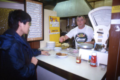 ハンガリー マスターに注文を頼む川端さん。 ![]() 食事をしたあと、木村さんの案内で「ラーツ温泉」に行く事となった。ハンガリーは温泉の豊富な国としても知られており、何と彼らは湯に浸かる習慣があるのだという。 入場料は180フォリント(約180円)で、中にはサウナはもちろん、マッサージに床屋、更に医者までいる。建物自体が石造りの古い宮殿のようになっており、日本の温泉にはない独特の雰囲気が味わえる。愉快なのは、入り際に係員がふんどしを手渡してくれること。日本のふんどしとはちょっと型が違うのだが、付けてみると我ながら絵になる。風呂内の客はもちろん皆ふんどし姿。 1時間もつかっただろうか、温泉は南米以来。すっかり満足し、今までの走行の垢も、汗も、51カ国分の疲れも全てとれたような気がした。 上がり際には、一人のおじさんがタオル片手に待っていて、お客様一人一人に渡してくれる。なんともリッチな気分に。上がった後は、なぜか眠くなってしまった。今までの疲れがどっと出たような感じだった。 テレザハウスに帰ってからは、ビザ取りのために大使館の住所を確認し、手紙書きの作業をする。そして今晩も夜中の3時まで旅の話に花が咲く。本当に日本人同士は良いものだと実感するひととき。 翌日、1995年1月17日。ブルガリア、ルーマニアのビザ取得のための写真を撮りに、すぐ近くの「4枚で200円」というバカ安の写真屋へ出向いた。仕上がりは明日なので、ビザ取りも明日ということになる。パスポートのページも少なくなったので、新しいものにしなければ旅は続ける事ができない。パナマで増補したが、そのページはあと何カ国か行けば終わりになってしまう。大使館に行ったとき、パスポート写真の大きさなどに規定があることを知った。その規定を満たす大使館指定の証明写真屋があると言うので、そこへ行ってパチッ。なかなかの仕上がり?だった。