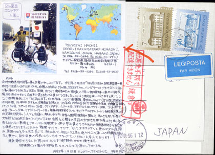 ハンガリー 手作りの50カ国達成記念報告ポストカード。 ![]() ポストカードを買った店の主人は、イギリスへ何回も行ったことがあるという人で、まるでイギリス紳士のような対応をしてくれた。 「いくらになりますかね?」 と交渉を始めると、 「7500フォリントだが、たくさんだからね。6500フォリントでいい。」 と安くしてくれた。1000フォリントのディスカウントは、テレザハウスでは宿2泊分がタダになる金額だ。嬉しかったー。 翌日、朝から人民食堂に行き、エネルギー補給。その後はマクドナルドでコーヒーと紅茶で4時までねばり宛名書き。そして宿へ帰って再び夜の11時まで作業を続けた後、遅い夕飯。書き疲れた・・・。 次の日の朝は足りない分のポストカード60枚を例の店に買いに行く。すると主はまたまけてくれた。感謝。この2日はとにかく作業をして明け暮れた。 翌朝、マクドナルドで日本人宛のカードにメッセージを書いていると、一人の老人が私のポストカードの量を見て目を丸くして話しかけてくる。多少英語のできるそのお爺さんは、元サイクリストだったらしい。 「そうか世界一周か・・・」 何か独り言を言うと、自分のテーブルに戻り、再び私のところに来て、 「ニッポンのトウキョウか?」 などと聞き、また再び戻っていく変わった爺さんだった。 この夜、テレザハウスで人気者だったブラジルのナガさんが夜の便で出発する事になった。日本生まれでブラジル在住のナガさんは、女性にも男性にも人気のある人柄だった。多くの人がナガさんを見送りに一緒した。名残惜しい気持ちで女性3人と、僕と関さんの計5人で、プラハへ向かうナガさんの乗ったバスをいつまでも見送った。ブラジル人は温かい人が多いような気がする。