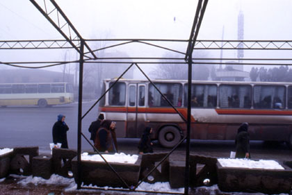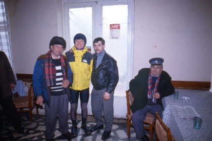 ルーマニア クルージュナポカの街。 ![]() ルーマニアに入ってから、どう言う訳か地元の人々との触れ合いが増えた。この日もまた、ルーマニア人の親切に触れることになった。 クルージュナポカの町を出て走り出すと、10km弱の急勾配の上りが続いた。 「寒いなー。」 と思ってペダルを踏んでいると、怪しい雲行きの中雪が舞って来た。寒い雪の中ではあるが、大きな峠の頂上に着く頃にはジャンパーの中は蒸れて汗びっしょりに。外は寒いので最悪。着替えないと風邪をひいてしまいそうだ。近くにBARと書かれた店があったので早速飛びこんだ。ポーランドのBARではスープやサンドイッチの軽食を食べる事ができたものだが、ルーマニアのBARは文字通り「バー」のようだ。 「こんな昼間っから飲むんだなあ・・・」 地元の人達は強そうなウォッカをグイグイと飲んでいる。車ではなく、馬車で来ている人々もいる。ウォッカでも飲まないと雪の中では寒くていられないのかも知れない。警察に見つかったら「酒気帯び馬車運転」と言う事で捕まってしまうのだろうか。 このバーで、飲んでいた男たちにつかまり、飲まされはしなかったが、一緒に写真を撮ったりした。中南米のような陽気さとでも言おうか、とてもここはヨーロッパとは思えない開放的なムードが漂っているような気がする。