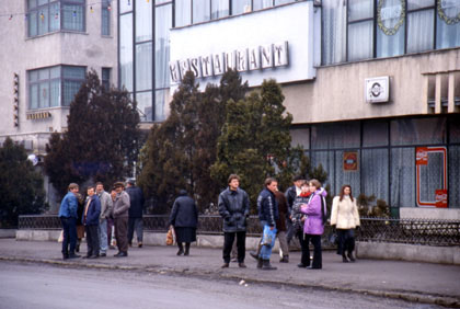 ルーマニア 左から3番目にいるのがブマリ。ちょっと危ないようにも見えるのだが・・・。右から2番目はラスロ。 ![]() 彼らは危険でも何もなく、とても親しみやすいローカルピープルだった。金をよこせとか、たかる訳でもない。私はお世話になってしまったので、少しでもとお代を払おうとした。すると、ブマリは、 「おまえは払うな。オレが何とかする。」 と言う。そう言ったものの、ブマリが近くにいた男に、「100レイくれ…」とねだっていたのを私は知っている。私を気遣ってくれたブマリの姿がとても印象的だった。人を救うという心、優しい気配りにあふれた人々が、この国には本当に多い。ちょっとでも困っていたら助け合うという考えは、この国では当たり前なのだろう。 翌朝出発の準備をしていると、ラスロさんがやってきた。昨日も彼は私のタイヤの修理を手伝ってくれていたのだが、 「良かったら自転車屋を知っているので、タイヤを買いに行かないか?」 と言うような事を言ってくれたのだ。私は彼の案内で、自転車屋へと向かった。ルーマニアではお店の事をマガジンと呼ぶらしく、このときのラスロさんも、 「マガジン、マガジン」 と言っていた。まさかとは思ったが、私のサイズに合うぴったりのタイヤが売っており、価格を聞くと5000レイ。何と300円。もちろんタイヤには「メイド・イン・ルーマニア」と書かれてある。私は早速予備として購入する事にした。 ホテルに戻り、どこか名残惜しい気持ちで出発することにする。立派な外見のホテルトランシルバニアは、1階がレストラン兼バーで2回のレセプションの正面がローカル銀行になっており、ホテルのような銀行のような変わった建物だった。 朝のバーにはウォッカを口に運ぶ老人がいたり、買い物袋を下げたおばさんがコーヒーを飲んでいたり・・・。1階の小さな部屋ではライター職人とでも言うのか、壊れた100円ライターを再び使えるようにする、まめな作業を行っている職人がいた。 一階ロビーに置いてあるポーカーのテレビゲームには、朝から6、7人の若者が群がっている。おそらく職がないのだろう。とにかくこのホテルトランシルバニアの一画は、色々な顔ぶれの揃うコミュニケーション空間だった。