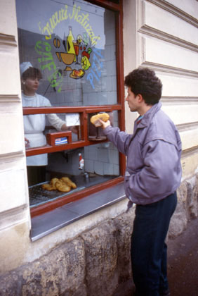 ルーマニア 路地脇では揚げたてのパンを24円で売っている。寒い日にホカホカのそれにかじりつくと、もうたまらない。