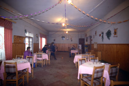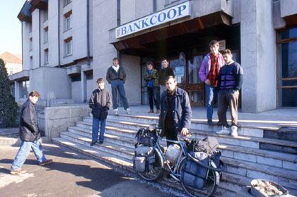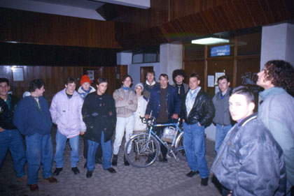 ルーマニア 言葉は通じないルーマニアでもおばさんのぬくもりは充分すぎるくらいに伝わってきた。 ![]() チンピアトゥルチの町に着いた。ポリスマンの情報通り、確かに10kmほど走った所にモーテルはあった。しかしこの時期は営業していないらしい。せっかくたどり着いたのにがっかり。 「あそこまで走れば・・・。」 そんな希望を持って走ってやっと着いたのに、更に走らされるとなるとたまらない。こう言うときが一番距離が長く感じて辛い。 「果たしてこの先にホテルなどあるのか。」 不安なまま走り続けた。宿に関しては、西側の国では野宿でテントと決まりきっていた。しかし、東側の特に物価の安い所まで来て自炊や野宿はしたくない。見つからないとなると余計に、意地でも宿に泊まりたいと思うようになってしまう。結局、私はホテルを探しながらルドゥシュの街まで走らされる事になった。暗い中、ようやくルドゥシュの街に着き、地元の人に、 「ホテルはこの町にあるか?」 とジェスチャーで聞くと、 「ここをまっすぐに行った左手にあるよ。」 と教えてくれた。今回はきっとホスピタルではないはずだ。そこには「トランシルバニア」という名のホテルがあった。見かけは立派、価格は1万レイ。約5ドルでトイレ、バス付き。しかし中はちょっと汚い。 「まあこんなもんだろう。」 とにかく屋根つきのホテルに着いて一安心。前輪タイヤのビードワイヤーが露出してしまっていたので、ホテルのロビーで修理していた。そこに、ブマリと名乗る男がコーラを持ってきてくれ、 「まあ、飲め。」 と言っている。6〜7人の青年たちと一緒に、 「良かったら俺たちとレストランにでも行かないか。」 と誘ってくれる。 「それはうれしい。」
