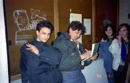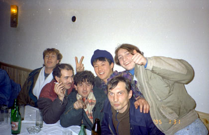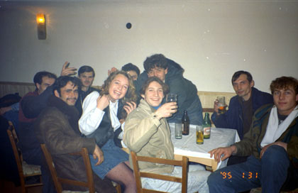 ルーマニア 誘ってくれたブマリ。(左から2番目) ![]() 「せっかくのルーマニア人の誘いを断るのも何だ・・・。」 旅のおもしろ味や醍醐味はそこにある。私はある程度金は部屋や自転車のバックに隠して、1万レイ、わずか500円ほどを片手に、彼らと一緒することにした。 彼らはレストランに連れて行ってくれた。ビールにポテトにポークの肉とご馳走してくれ、その後は、 「ディスコへ行こう。」 と誘ってくれるが、 「ちょっと今日は疲れてしまって・・・」 と、断ろうとすると、 「ルドゥシュに2泊でも3泊でもしていけばいい。」 みたいな事を言ってくれる。 「じゃ、5分だけ。様子だけ見て帰るね。」 と言うような事を伝えて、ディスコへ行く。しかし結局、1時間半ほどいろいろルーマニア語でコミュニケーションをとることになった。アンジェラという愛想のいい可愛い娘がいて、彼女と写真を撮ったり、訳が分からないままテレビゲームのトランプゲームをしてみたり。 「このマシーンは日本製だ。」 彼らは嬉しそうにそう言っていた。