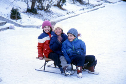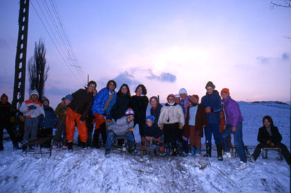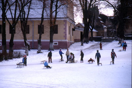 ルーマニア 私の姿を見ると「オーイ」と駆け寄ってきた木こりおじさんたち。男たちに励まされ、元気が出てくる。 ![]() 峠を下ってからもブラショフへ続く道には雪が降り積もっていた。やはり白銀の世界である。周囲の学校の庭や道沿いの空き地では、元気に楽しそうに橇で遊ぶ子供たちの姿が見られた。さっきまでは物乞いの子供たちの姿も目にしたのに、ここではまた子供たちの姿も違っている。