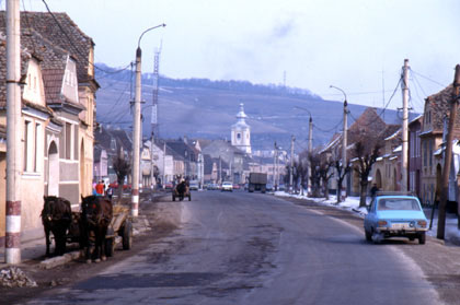 シギショアラで泊まったホテルのフロントで20USドルを両替して、今日もペダルを踏み出す。町を過ぎるとすぐに馬車に乗った地元の人たちとすれ違うようになった。 「いいもんだなー。」 馬がパカパカと走り行く姿は、ほのぼのとしており、和やかそのものだ。西欧の快適なサイクリングロードもいいが、こうしたルーマニアの田舎道をペダルするのもいいもんだ。