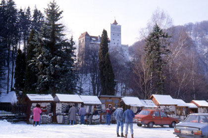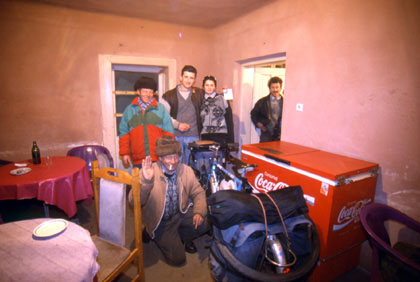 ルーマニア レストランで100回目のパンク共同修理記念撮影。(?) ![]() 気温0℃の夜8時。明るいネオン灯るブラショフに到着した。日が暮れたあとの宿探しにはまた難儀。目に付くのは高級ホテルばかり。 「はー困ったな・・・。」 近くにいたタクシードライバーに尋ねると、 「ちょうどこの裏に『ホテルスポーツ』と言うのがある。これはブラショフでも安いほうだよ。」 と言われ早速向かったが、ホテルの前に着くと、待ってましたとばかりに客引きのおばちゃんに捕まってしまった。かなり体格の良いおばさんで、片言の英語で、 「安い部屋がある。」 と言っている。ペンション経営をしているそのおばさんの名は、ノバックアナさん。ホテルは34000レイ。おばさんの所は15000レイだと言う。しかし私は値切ってもらい、 「12000レイでどう?その代わり2泊するから。」 とお願いすることにした。安宿に泊まる事ができて、ほっと一安心。 100回パンク記念もあったので、宿に着いてからシャワーを浴び、ブラショフの街中のレストランへと出向いた。しかしすでに閉店している店がほとんど。どこかにいいレストランはないだろうかと、明かりの灯る通りを歩いていると、カップルが声をかけてくる。どこか親切そうな感じはした。 「どこへ行くんだい?」 と聞いてくるので、 「レストランへ。」 と言うと、 「俺たち、いい店を知っているから一緒に行こう。」 と言う。割と大きな観光客のいるブラショフのような街中、それも中心地で私のような旅行者に声をかけてくるケースはどこか信用ならないなあ・・・そう思いつつも、私は彼らとレストランへ同行した。彼らは今まで私に良くしてくれたルーマニア人の行動パターンとは明らかに違っていたのだが、その不安は見事に的中。美味そうなお勧めメニューを頼んでくれたのは良かった。それからビール3本にワイン1本を勝手に頼んだ後、 「夕食代は全部君が払うんだ。」 と言う。 「え?割り勘じゃないのかな・・・私が払うのは食事とビール1本、このワインもあなたの食事代も払うのはあなたですよ。」 この時点ですでにワインの栓は抜かれていた。最初からただ飯、ただ酒が目的だったのか。どうも気安く声をかけてくるから、おかしいとは思ったが。確かにワインも高級だったし食事も高いものだった。こんな所に入ったのが間違いだった。私が払わないと知ると、彼らはささっと外に出て行ってしまった。単に食事代を支払わせようとして誘ったのかもしれない。でもこう言うことを平気でやってしまうと言う事は、簡単に支払う人がいると言う事だろう。 「見知らぬ旅行者を捕まえて食事代を払わせるとは、けしからん奴だ!」 と思う反面、今まで世話になったルドゥシュのブマリやルーマニアの優しくしてくれた人の事を思い出した。 「誘ってくれたのだから、やっぱりおごってやれば良かったか・・・おごってやったって良かったんじゃないか?」 少し後悔の念がわいた。日本人にしてみれば決してバカ高い食事代ではない。しかしこのときの彼らは確実に善意ではなく、旅行者を騙そうとした行為だ・・・だからあれで良かったんだ。私は必至に自分のとった行動を正当化しようとした。 「あのときおごってやったら、きっとまた同じ事を繰り返すかも知れない。あれでいいんだ。」 と。 翌日2月4日。ブラショフには2泊の予定。と言うのもブラン城を少し観光しておきたかったから。宿のおばさんノバックアナさんは、 「フルモーサだよ」(美しいの意らしい:スペイン語で美しいはエルモーサ) と言う。このブラン城はドラキュラ城のモデルにもなった城だそうだ。プライベートハウスから歩いて5分ほどの所にバス停があり、近くの人に、 「カステリ、ブラン?(ブラン城へのバスは?)」 と言うと何となく通じたようで、ブラン城へのバス乗り場を教えてくれる。50分ほどバスに揺られて目的のブラン城に到着。 「これがドラキュラで有名なお城?」