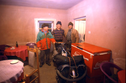 ルーマニア 橇で遊ぶ元気な子供たち3人・・・いや4人だ。 ![]() この日は、長旅ならではの貴重な走行記録が生まれた。シギショアラを出発して丁度100km位走った所だった。後輪タイヤがふにゃふにゃとパンクしたのだ。 「やったー。遂にパンク100回目だ。」 私は最寄のレストラン前のコンクリートの上で、食事がてら修理する事にした。すでに5時近く、暗くなりかけの中手袋をはめてパンクの修理を始める。修理しながら私は半分喜んでいた。100回。出発してから100回目のパンク。こうなると、もっとパンクしないかと、150回、200回を楽しみに待つような気持ちにもなってしまう。 私は記録に喜びながら、パンク修理をしていた。そこにやって来たのは、隣にあった車の修理工場帰りの地元のおじさん。2、3分ほど私の様子を興味深く眺めていたのだが、そのうちいてもたってもいられなくなったのか、 「俺によこせ。」 と言わんばかりに私のパンク修理作業を横取りしてしまった。チューブから抜ける空気の量が今一つ少なく、修理の最中にバルブが妙なところから取れてしまったりもしたので、これはパンクではなくきっと空気抜けだと勝手に解釈していた。私は手伝ってくれている爺さんに、 「これはチューブをこっちの新しいのに変えてオッケー。たぶんパンクではないですよ。」 と言うと、 「いや、そうではない。ちっちゃな何かがここに絶対刺さっているんだ。」 そう言った。ちょっと強情そうな、その爺さんの名はインツァ・ステファンさん。すぐ近くのトイレの明かりのある所でステファン爺さんはタイヤをチェックし始めた。 「そんなの何も刺さっちゃいないよ、きっと。」 私はジェスチャーと日本語と英語で言い張った。ところがしばらくすると、 「見ろ、ここだ、見てごらん。」 ステファン爺さんは、髪の毛の様に細いワイヤーが刺さっているのを見つけ出してくれた。よくもこんなものが刺さったものだと感心させられるくらいの細い針。2mm位タイヤの内側に刺さってしまっている。 「わーほんとうだ。すごい・・・ムーツメスク、(ありがとう)」 と私はステファン爺さんに礼を言った。もし爺さんが見つけてくれなかったら、いや、余計なお節介をしてくれなかったら、私は修理後に再び真っ暗な中で101回目のパンク修理に頭を痛めていたことだろう。感謝・・・。 レストランでステファン爺さんとその仲間と軽い食事をし、ありがとうを言って、再びブラショフに向けて走り始めることにした。真っ暗になってしまったが、ステファン爺さんにパンクを発見してもらったせいか、とても元気に残りの20kmを町まで走り切る事ができた。100回目のパンク修理はてこずったが、地元のステファン爺さんたちと楽しく修理をすることができ、ハッピーエンド。こんな楽しいパンク修理ならいつでも大歓迎なのだが・・・。目指すはパンク200回か。