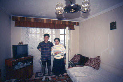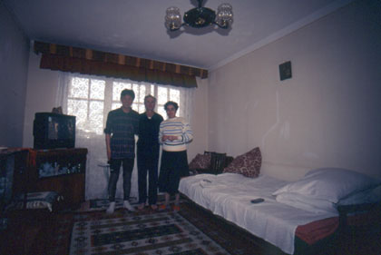 ルーマニア 早く食べたい・・・。 ![]() 多少の追い風の助けもあり、まだ明るい夕方の4時くらいにはプロイエシュティに着いた。街では安宿を探して泊まろうと考えていたので、着くと同時にいつものように、見かけたホテルを手当たり次第、 「1泊おいくらですか?」 と尋ね歩く。しかし6万レイ(約3600円)に11万レイとぶったまげるような値段ばかり。 「これは弱った・・・。とにかくまだまだ探して見よう。」 と町をウロウロしていると、一人のおじさんが、声をかけてきた。 「どこから来たね?世界一周かね?」 そんな事を聞いてくる。この人は悪い人ではない。話し口調や瞳を見て瞬間的にそう判断した。 「ええ、そうですけど…。この辺に安ホテルは?」 と聞くと、この町には3、4件しかホテルはないよと言う。 「わしと一緒に来なさい。ホテルツーリストという安目の宿が一軒あるから。」 とわざわざ案内してくれる事になった。ところがそこで値段を聞くと6万レイ、3600円もする。高いのに驚いている私の様子を見てか、 「良かったらわしの家に来んか?」 と、その男性、ムシャット・コンスタンチンさんは言った。 「こんな格好で?」 ジャンパーも自転車も雪道を走ってきて真っ黒でびしょびしょだ。 「かまわん、かまわん。歩いて20分くらいじゃから。」 こうして私はコンスタンチンさんの家におじゃまする事になった。彼の家は、私が以前からどんな人々がどんな風に暮らしているのか疑問を持っていた、公営あるいは国営の平均的なアパートだった。