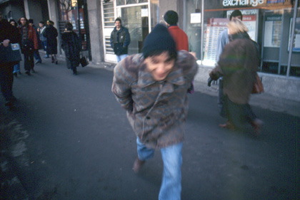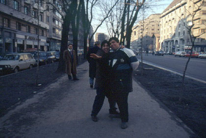 ルーマニア 芝居の下手なブカレストの悪役者たち。一番左が警官役。(笑) ![]() その次の両替商も少し相手にしてあげた。皆似たようなパターンだ。どんな騙しのパターンなのかを見抜くのが楽しくて、両替もしないのに、彼らが誘ってくれるのを待っていた。 「そんな甘い手でツーリストは騙されはしないのだ!」 と思ってみても、日本から直接このルーマニアにやって来たとしたら、私はきっと何度も彼らに騙されていたかも知れない。そんな両替商の写真を撮ろうと思ったら、ふざけて突っ込んできた。