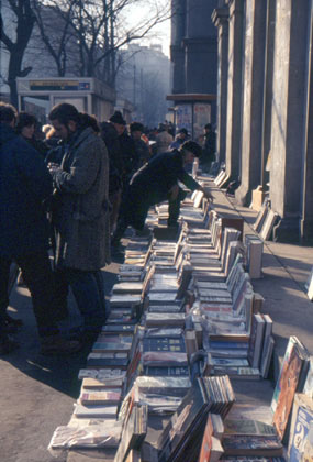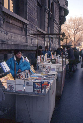 ルーマニア 雑誌や本などが並ぶ路上書店。
